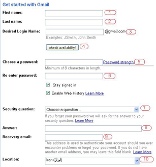 حالا بر روی نوشته create new account (ایجاد حساب جدید)کلیک کنید تا صفحه زیر نمایش داده شود که در هر قسمت عددی نوشته شده است و شما می توانید با توجه به عدد مربوطه ، توضیحات آن را در زیر تصویر مشاهده فرمایید.
