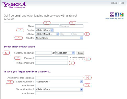 6- در اینجا باید نام IDکه برای خود دوست دارید وارد نمایید.دقت کنید که این نام باید بدون @yahoo.com باشد و از کاراکترهای مجاز استفاده کنید.بطور مثال اگر ازکاراکتر- (خط تیره) استفاده کنید ، با پیغام خطایی روبرو می شوید.پس از وارد کردن نام مورد نظر می توانید بر روی دکمه Check که در جلوی همین قسمت قرار دارد کلیک کنید.حالا اگر با پیغام خطایی به رنگ قرمز روبرو شدید ، بدانید که شخصی با این ID وجود دارد و یا شما از کاراکتر های غیر مجاز استفاده کرده اید. اما اگر یک پیغام با رنگ سبز برای شما نمایش داده شد یعنی نامی که برای ID خود انتخاب کردید درست بوده و فقط شما این نام را در بین تمام اشخاصی که ازYahoo استفاده می کنند دارید.(نام ID یک نام یکتاست و باید هر کس فقط یک نام ID داشته باشد و دو شخص با یک نام ID هرگز نمی توانند ثبت نام کنند.)