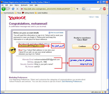 حالا با کلید زدن بر روی دکمه Create My Account (ایجاد حساب من ) می توانید ، به اشتباهات احتمالی خود در هنگام پر کردن فرم پی ببرید و اگر در هنگام پر کردن فرم اشتباهی نداشته باشید ، صفحه ای همانند تصویر زیر باز می شود.(دقت داشته باشید که این ایمیل بطور آزمایشی درست شده و اطلاعات نمایش داده شده در این صفحه با اطلاعات شما تفاوت دارد.)