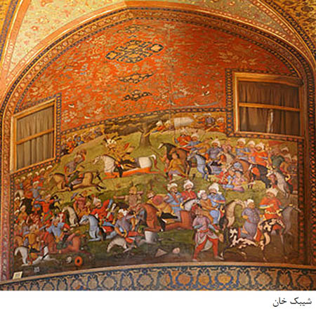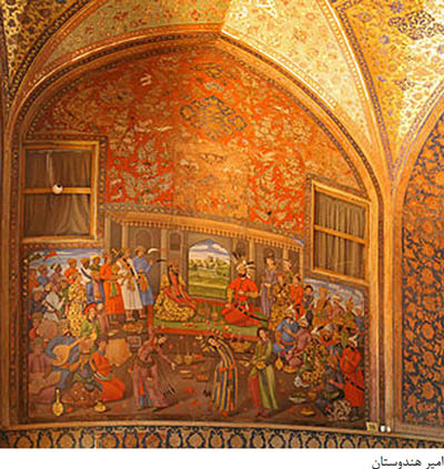 4ـ تزیینات عالی طلاکاری سالن پادشاهی و اطاق های اطراف تالار آینه و تابلوهای بزرگ نقاشی تالار پادشاهی مانند شاه عباس اول در پذیرایی از «ولی محمدخان» فرمانروای ترکستان، شاه عباس دوم در پذیرایی از «ندر محمدخان» امیر ترکستان و . . .