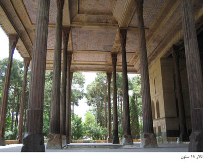 2ـ ستون های عظیم تالارهای 18 ستون و تالار آینه که هریک از آنها تنها تنۀ یک درخت چنار است.