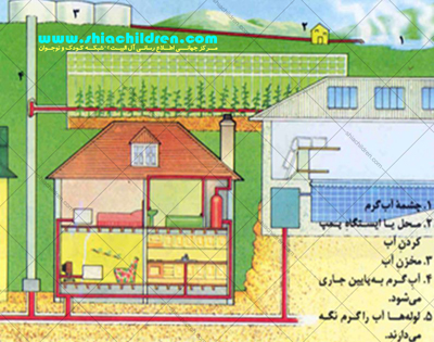 در شکل زیر یکی از راه های استفاده از چشمه های آب گرم نشان داده شده است. آب این چشمه ها می تواند خانه ها، مزرعه ها و ورزشگاه های سرپوشیده را گرم کند.
